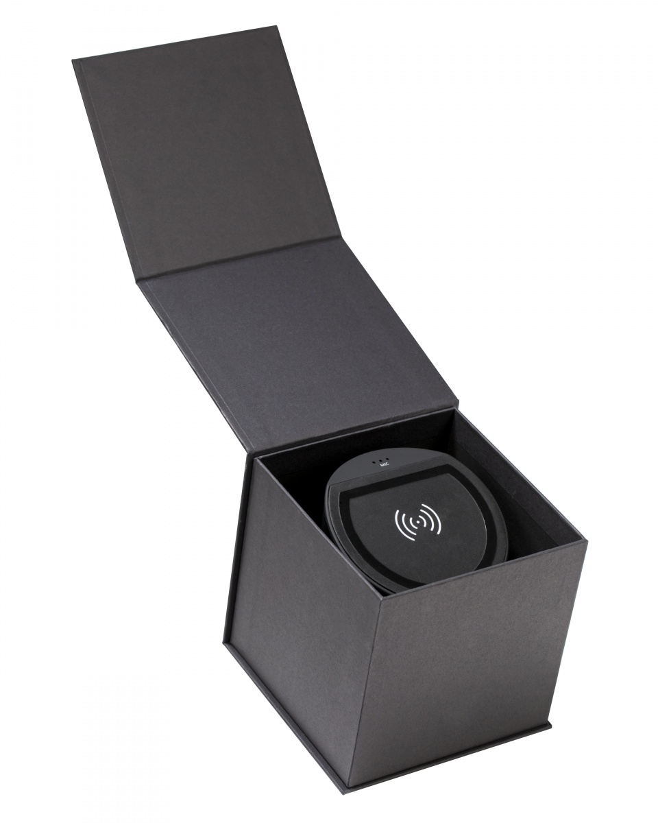 5W speaker in rubber, equipped with a wireless charger and lighting logo.
